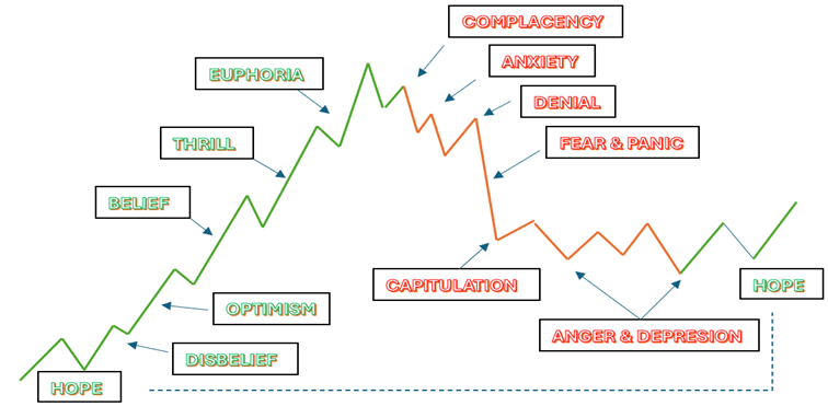 Investing in financial markets is not just a numbers game, it’s an emotional journey. Investors often experience a cycle of feelings that follow the market’s ups and downs. Understanding these psychological stages can help you better navigate volatility and make more informed decisions.